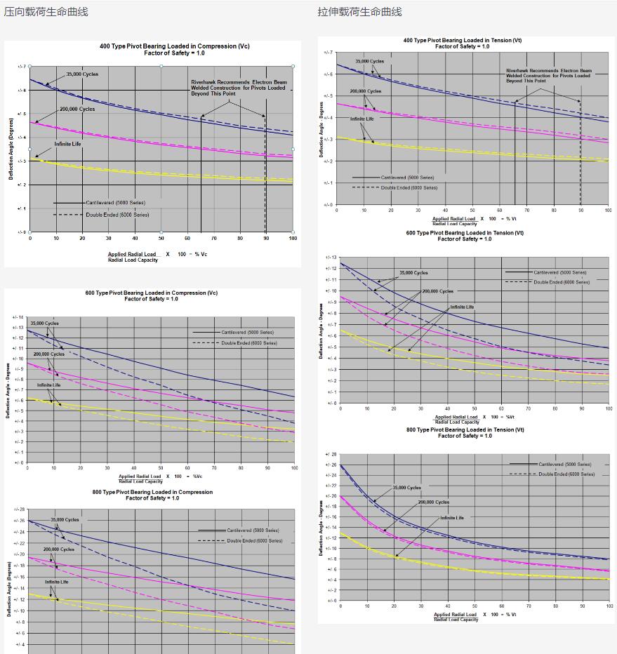 第 4 步 – 從圖表中確定哪些樞軸的 Vt 或 Vc 負載能力高于您施加的負載??赡苡袔讉€(gè)。每個(gè)樞軸的外徑位于左側列中。選擇一個(gè)或多個(gè)尺寸適合您的應用。請注意“尺寸類(lèi)型”和下一步使用的徑向負載能力。第 5 步 – 現在您必須考慮樞軸的循環(huán)壽命。在網(wǎng)站上進(jìn)一步向下滾動(dòng)到生命周期曲線(xiàn)。如果您的徑向載荷在 Vt 方向,請使用右側的張力載荷曲線(xiàn)。如果您的徑向載荷在 Vc 方向,請使用左側的壓縮載荷曲線(xiàn)。您將使用與您選擇的樞軸的“類(lèi)型”相匹配的曲線(xiàn)(400、600 或 800)。第 6 步 – 計算生命周期曲線(xiàn)水平軸上顯示的徑向載荷百分比。然后,您可以輸入該百分比的曲線(xiàn),并根據顯示的曲線(xiàn)確定無(wú)限壽命、200,000 次循環(huán)或 35,000 次循環(huán)的**旋轉角度。第 7 步 – 如果**角度或生命周期不滿(mǎn)足您的應用要求,您將需要選擇另一個(gè)樞軸并再次檢查圖表,重復直到您確定滿(mǎn)足您的角旋轉和徑向負載要求的樞軸。第 8 步 – 您可能還需要考慮扭轉剛度(顯示在特性圖表的**后一列中)。您的應用可能需要非常硬或非常軟的彈簧。請注意,隨著(zhù)施加的徑向載荷增加,扭轉剛度會(huì )發(fā)生變化。要了解扭轉彈簧剛度如何隨徑向載荷變化,請參閱工程數據手冊。并非所有需求組合都是可能的。通常,設計者需要非常高的徑向載荷,但也需要高角度旋轉。正如您從圖表中看到的那樣,這就是權衡。與其他類(lèi)型的彈簧一樣,非常堅硬的樞軸將支撐更高的負載,但不能長(cháng)時(shí)間以高角度循環(huán)。